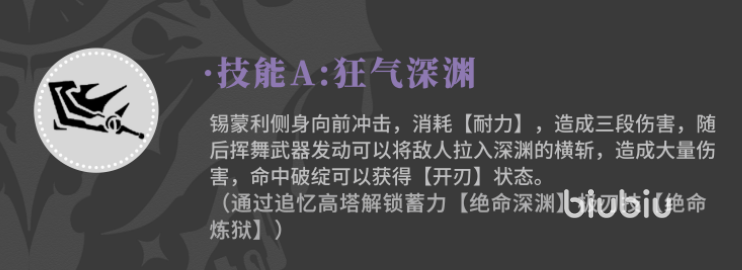 锡蒙利的一技能狂气深渊会用侧身姿态向前发起冲击,消耗耐力进行三段连续斩击。随后,她会奋力挥舞武器,在战场上撕裂出一道深渊将敌人吞噬,并以一记强力的横斩收尾,造成大额输出伤害。