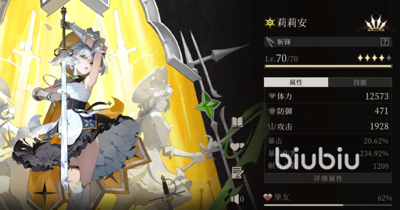 莉莉安的普攻会连续攻击5次,在怪物击倒状态下运用可额外回复耐力,她的“除恶”会将剑举到自己的身前,对四周范围内的敌人打出多段伤害,最后高举剑打出致命一击,她的“盛放”会让自己的生硬原地消失,在前方位置划过一个剑阵,在消失的期间自己不会受到伤害,她的“突刺”会拿着剑想前方突刺攻击,形成一定输出,命中敌方破绽能得到“开刃”,她的大招会召唤出多个分身,并在地面上形成发光图案,分身会在瞬间发动多次攻击,消失后本体会快速冲刺,并让图案消失带来巨大的伤害,此时刃心的阶段可以带有不同幅度的伤害提升。
