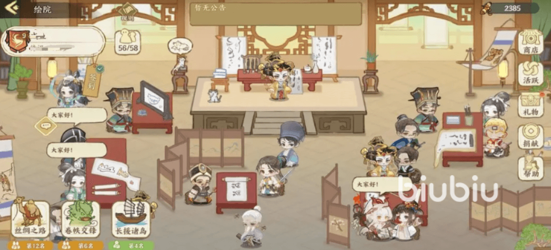 然后是丝绸之路,在该玩法中每个成员每天都能获取到1次前往西域的次数,成功通关一座城池后可以前往下一座,在这个途中能获取到文物升级材料,并提升绘院的整体排名,每周会根据排名发放奖励,接着是绘院礼物每当有成员买礼包时,所有成员都会获得一份礼物,其中包含各种资源。