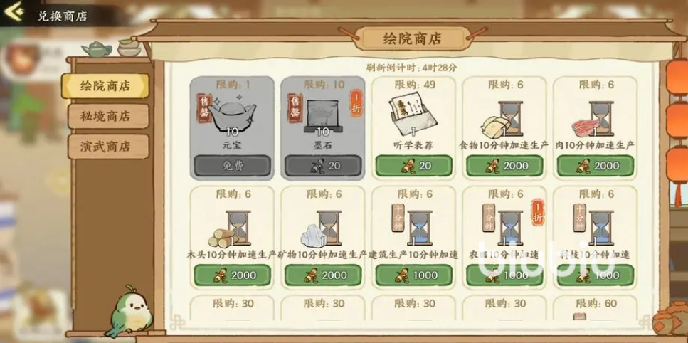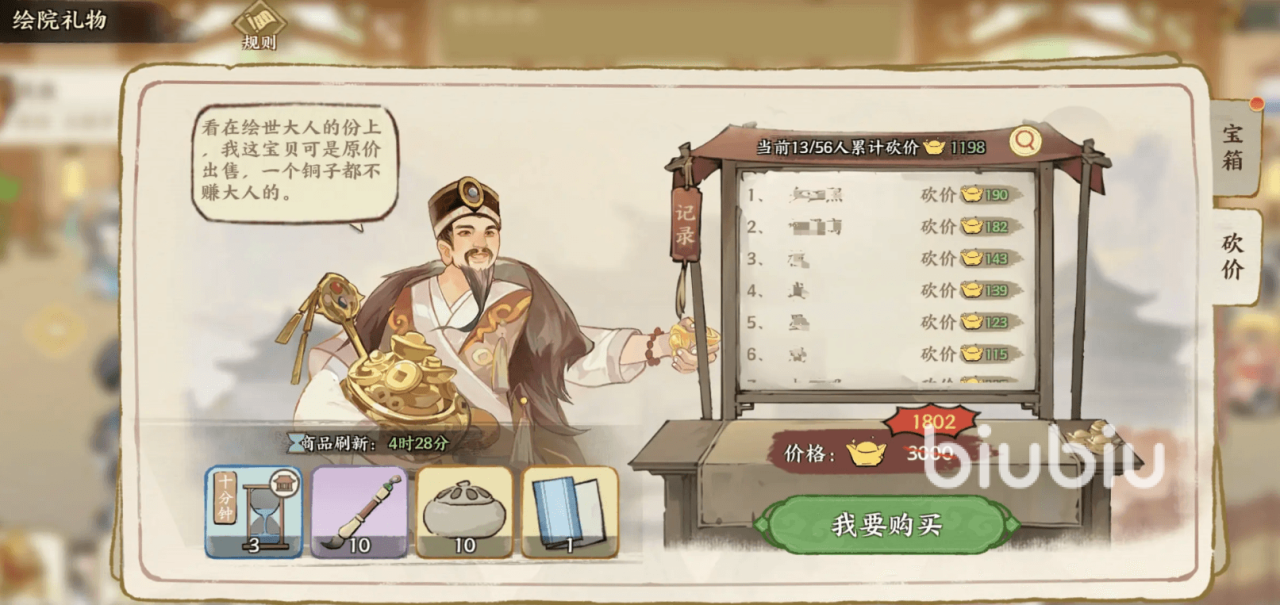 绘院玩法很多,首先是商人,在这里绘院的成员们每天有1次砍价机会,砍价时会随机削减购买物资的元宝消耗,让所有成员共享同样的价格,价格最低可以被成员一起砍到负数,变成负数后购买,能直接获取到额外元宝。