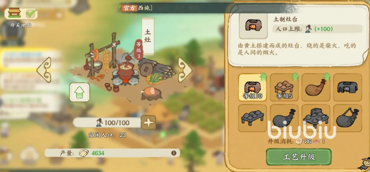 土灶可以产出食物,而畜牧场能产出肉,食物和肉可以用来提升建筑内部的科技。