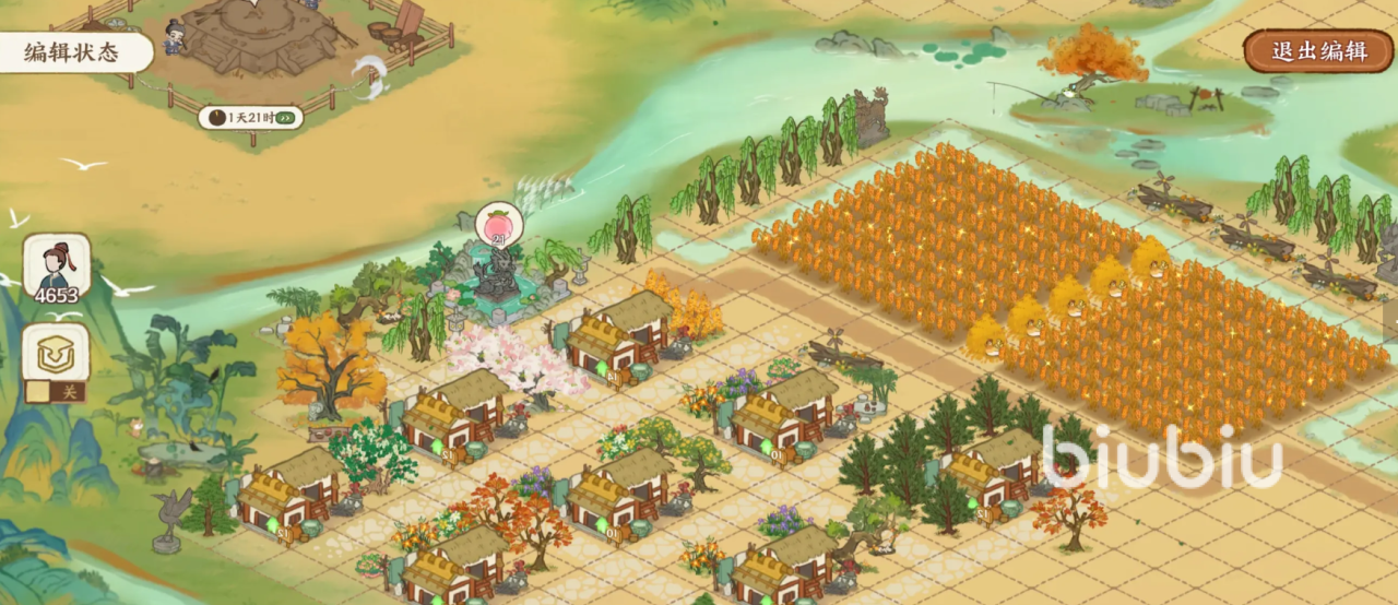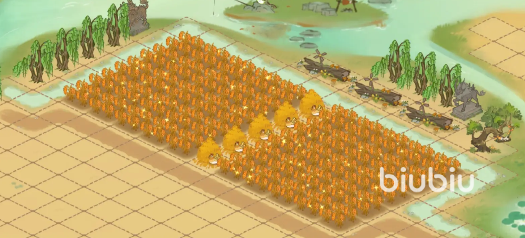 正式布局建议先放好田地,把田地分成两大部分,中间是草,另外一侧可以从河流当中引水,另外一侧留出一条道路来方便局面打理作物,因为左侧桃源的访隐建筑是不可以移动的,所以可以在旁边种植上柳树,这样才能更加自然。