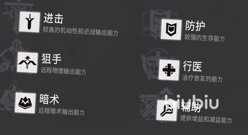 目前这个游戏中有6大职业,非别是进击、防护、狙击、行医、暗术、辅助。进击属于是有较高的机动性的职业,以近战输出为主。防护则有很强的生存能力,可以抗下怪物的伤害。狙击是远程输出类的职业,攻击频率和伤害都不错。行医则可以治疗队友。暗术也是远程输出职业,只是攻击类型不同,使用特殊暗术。辅助职业主要是给其成员加增益和减益。