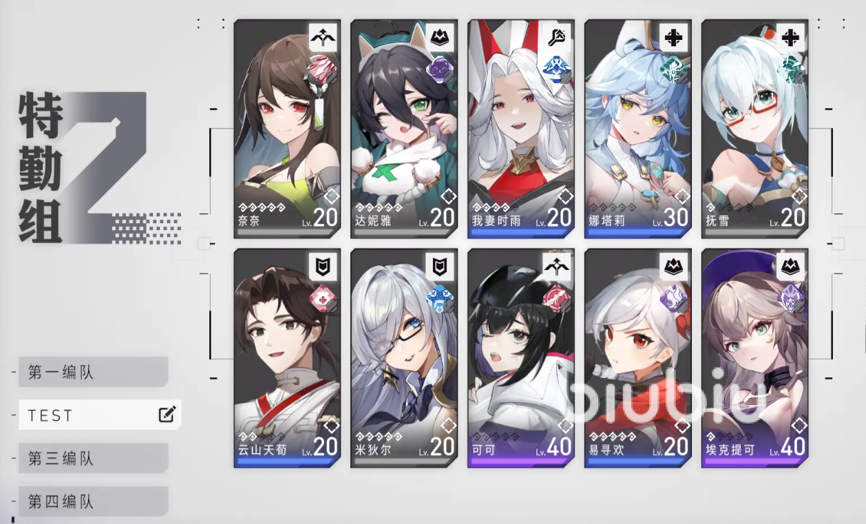 游戏里一场战斗可以携带最多10个角色作战,但能同时在场的最多只有8个。对处于新手期的玩家来说奈奈、达妮雅、抚雪、米狄尔、我妻时雨、娜塔莉、云山天苟、易寻欢,这些角色都是蛮好用的,前期送的可可也是必须练的狙击角色,清理杂鱼和空中飞机都非常好用,新手池中能抽到的SSR也是必练的角色,10人配队上最终推荐方案是2个防护加2个狙击加2个行医加2个暗术,剩余2个位置灵活选择。