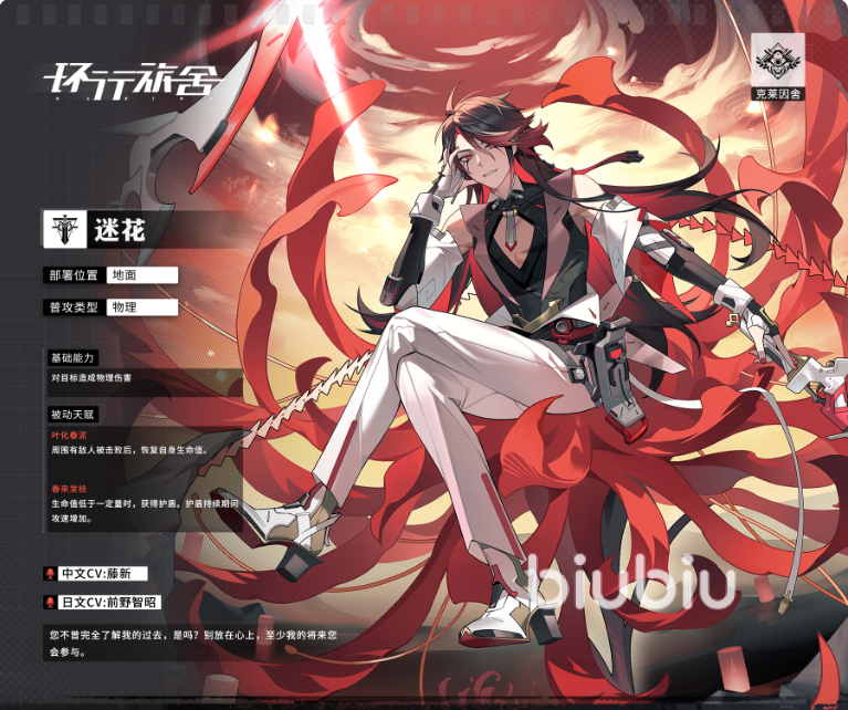 迷花这个舍友的部署位置在地面上,普攻就是对对手造成物理伤害,第一个被动技能叫做叶化春泥,当迷花周围有对手被击败之后,迷花自身的生命值能够得到回复,第二个被动技能叫做春来发枝,当迷花的生命值低于一定的数值是会触发,生命值低于一定量的时候自身会获得一个护盾,同时能够增加迷花的攻击速度。
