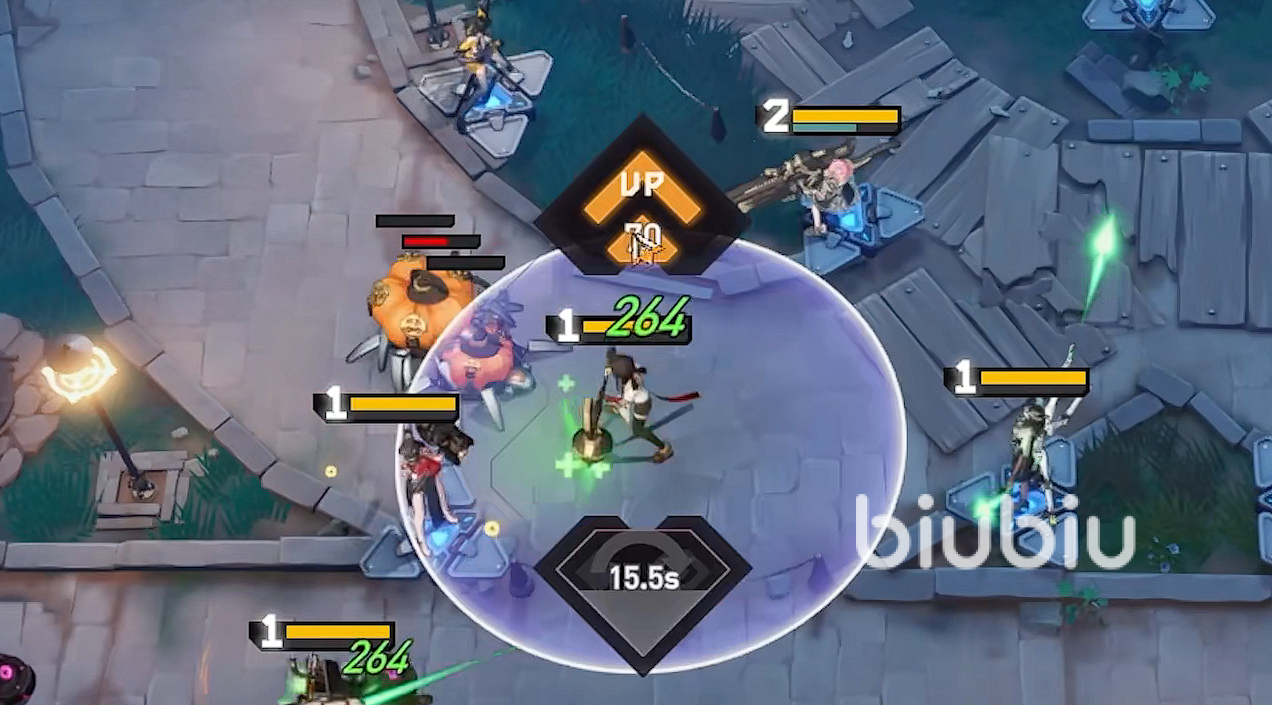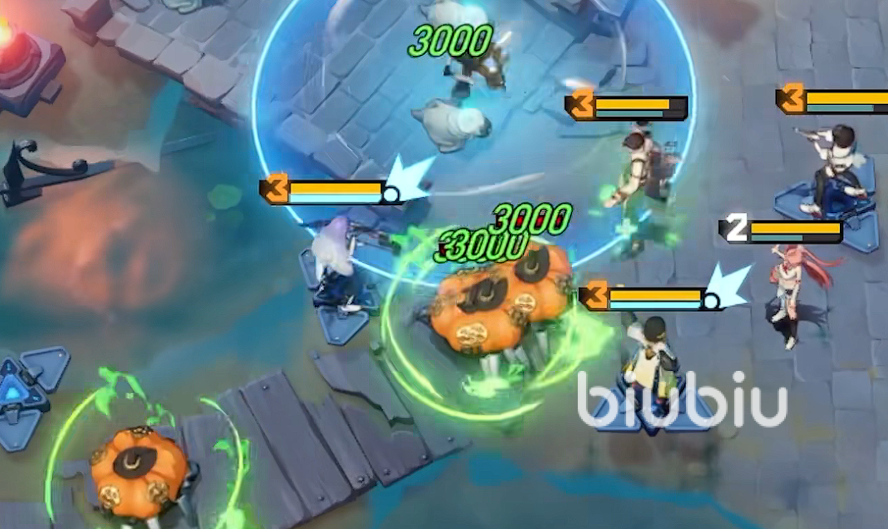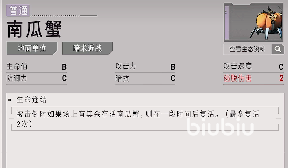 除了自己的角色以外,玩家们还要了解一下敌方怪物的特性。游戏中有一些怪物的效果特别恶心,就比如说这个南瓜怪,被击倒的时候,如果场上还有其他剩余存活的南瓜蟹的话,那么被击倒的南瓜蟹则会在一段时间内复活。最多复活两次,看起来平平无奇,但是一复活就是满血。再配合对面被击倒时可以治疗的怪物就会非常的难受,角色练度不高的话,很容易会崩掉。