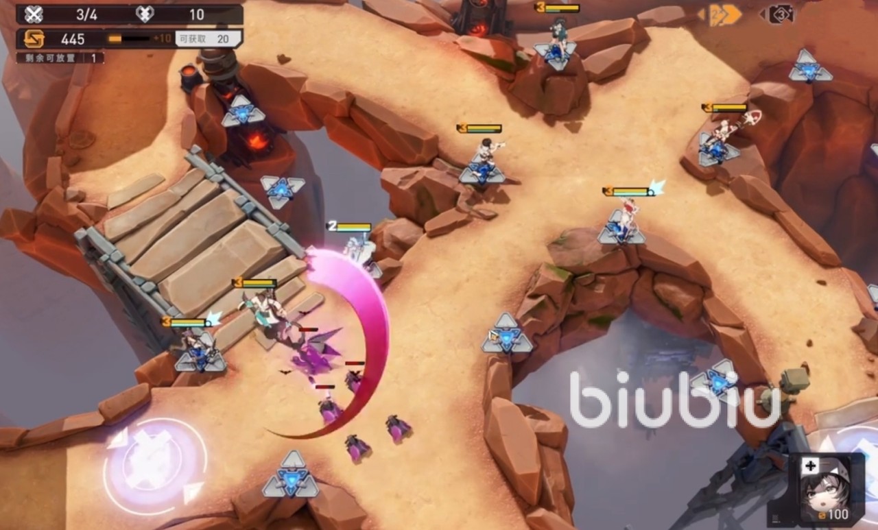 每一局敌人有固定的进攻路线,我们可以把地面位置的角色部署在道路上进行阻挡,高台角色只能放置在高台点。已部署的角色再撤回会有很长的冷却,被毙会后将在原地读条复活,在此期间该格子不可用。