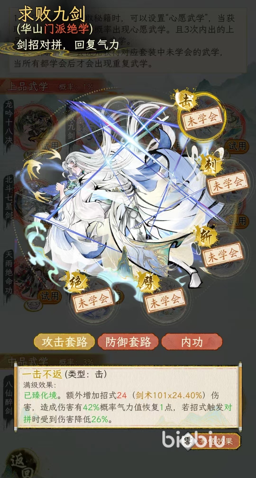 根据目前测试中的情况,位于t0层次的武学主要有两个分别是少林门派的绝学金刚降魔剑和峨眉门派的绝学越女剑法,这两个目前处于断崖式领先的地位。首先是金刚降魔剑,它的攻击套路是造成伤害时有几率降低对方1点气力值,且造成内伤效果。不同的招式触发降低气力值的几率有所区别,如果是绝招三入地狱,那么有100%的几率降低对方气力值,造成的内伤效果能持续三回合。对方被内伤之后无法蓄力,无法触发加气力值的效果,可以说很好地限制了对方发挥。