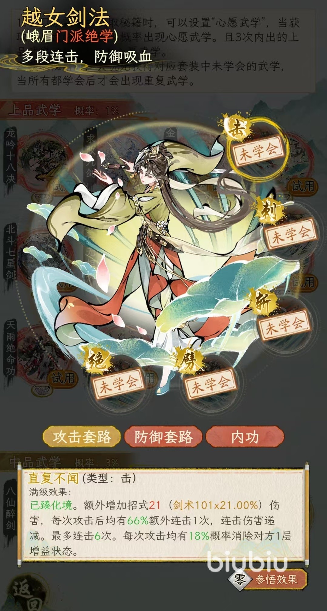 金刚降魔剑的防御套路,特点是防御成功时有几率给自身附加金身状态。在此状态下受到攻击只减少1点气血,生效1次,是非常强势的防御型套路,所以说金刚降魔剑真正做到了有攻有防非常全面。越女剑法的特点是具有多段连击效果,有吸血的能力。攻击套路是每次攻击后都有几率触发额外的连击,连击伤害递减。根据不同招式,最多连接次数有所不同,例如绝式百无禁忌,最多能连击8次,另外每次攻击还有几率消除对方1层增益状态。防御套路则是在防御成功后为自身附加吸血。