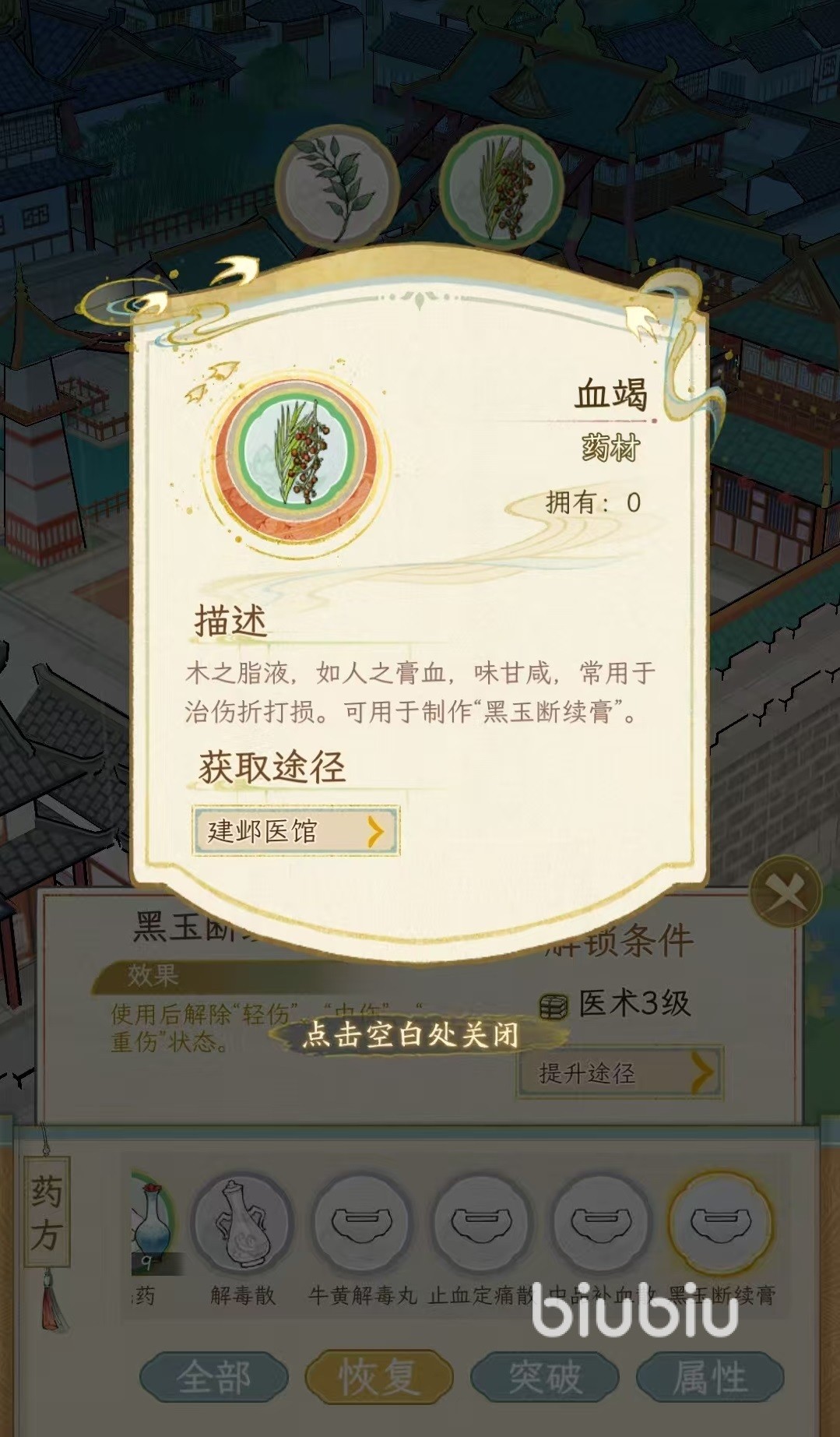 和烹饪玩法不同的是,在制药的时候直接就明确了配方,不需要自己再逐个尝试。大家需要做的只是收集足够的材料,先从低等级开始不断炼制,然后逐渐提升等级,就能制作更高级的药品了。制作的药品一共分为三大类,分别是恢复、突破和属性。数量最多的是恢复,作用就是用于恢复血量和解除各种状态。例如顶级的恢复药品黑玉断续膏,使用之后直接解除轻伤、中伤和重伤等状态,需要药草和血竭来制作得到。恢复血量的药品例如中品补血散,使用之后直接储备2万点储备气血,只需要药草可以直接制作出来。