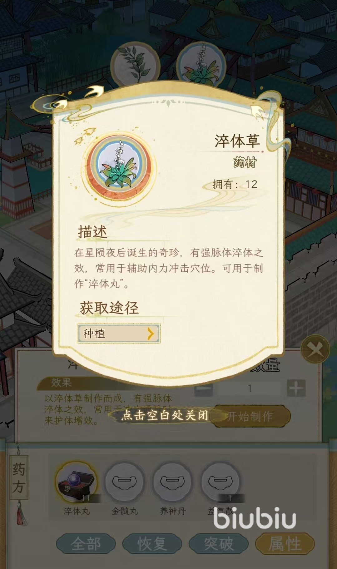 突破类型的药材非常关键,是修炼的必备品,主要包括下品悟剑丹、中品悟剑丹、上品悟剑丹以及天命玉露等。需要用到的材料包括药草、悟剑草、悟剑果和悟剑参等。属性药品主要包括淬体丸、金髓丸、养神丹和益气散。其中淬体丸是前中期最重要的药品,需要药草和淬体草得到,淬体草通过家园就能大量种植,用于冲穴通脉时护体增效。。