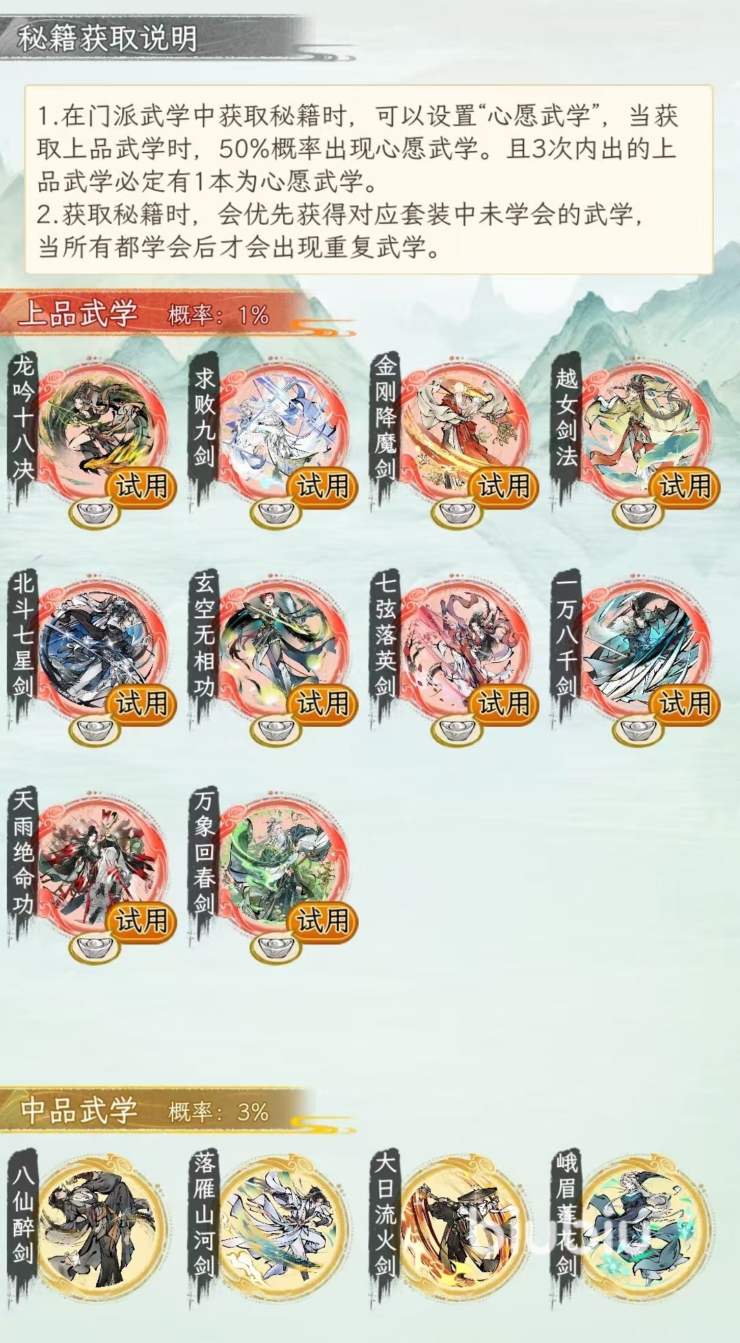 简单来说,在这个活动中抽取是有一定的保底机制,而且有一定的指向性,不过并非是绝对的。保底80抽,而且可歪两次,这里歪的意思指的就是没有抽到心愿武学,前5个抽到的武学一定是不重复的攻击招式,不会抽到内功。直到5个攻击招式都为红色之后,才会抽到其他的招式,每进行250抽,可以自选一个红色武血,这个机会小编建议留着换比较强力的内功。除去保底之外,获得尚品武学的几率是1%,中品武学的几率是3%,下品武学的几率是9%,其他道具的几率是87%。
