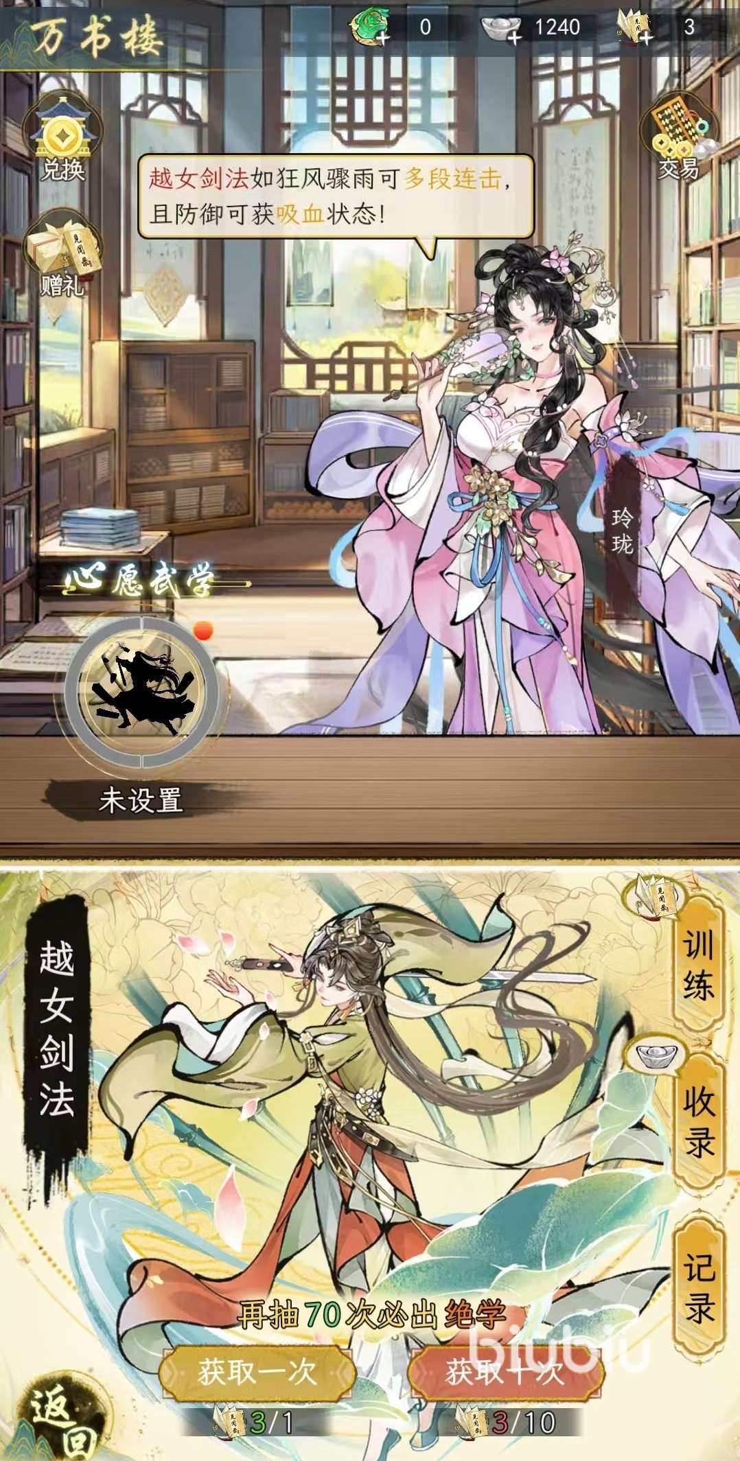 在抽的时候也是有着一定的技巧,对于平民玩家来说,心愿可以先选择越女或者是少林,抽到劈或者是绝之后,再换另一个去抽,如果劈和绝歪掉了,可以考虑换号了。在开局先凑20抽,如果能抽到金刚绝是最佳的选项,没有抽到之后可以换号再重刷,抽到金刚劈也可以暂时使用,后续再调整继续抽。在日常中,玩家可以通过任务、人物好感度、文房密匣、日常委托、开宝箱等方式来获得抽取道具。另外在这里还有几率获得剑意,是升级内功外功不可缺少的材料。