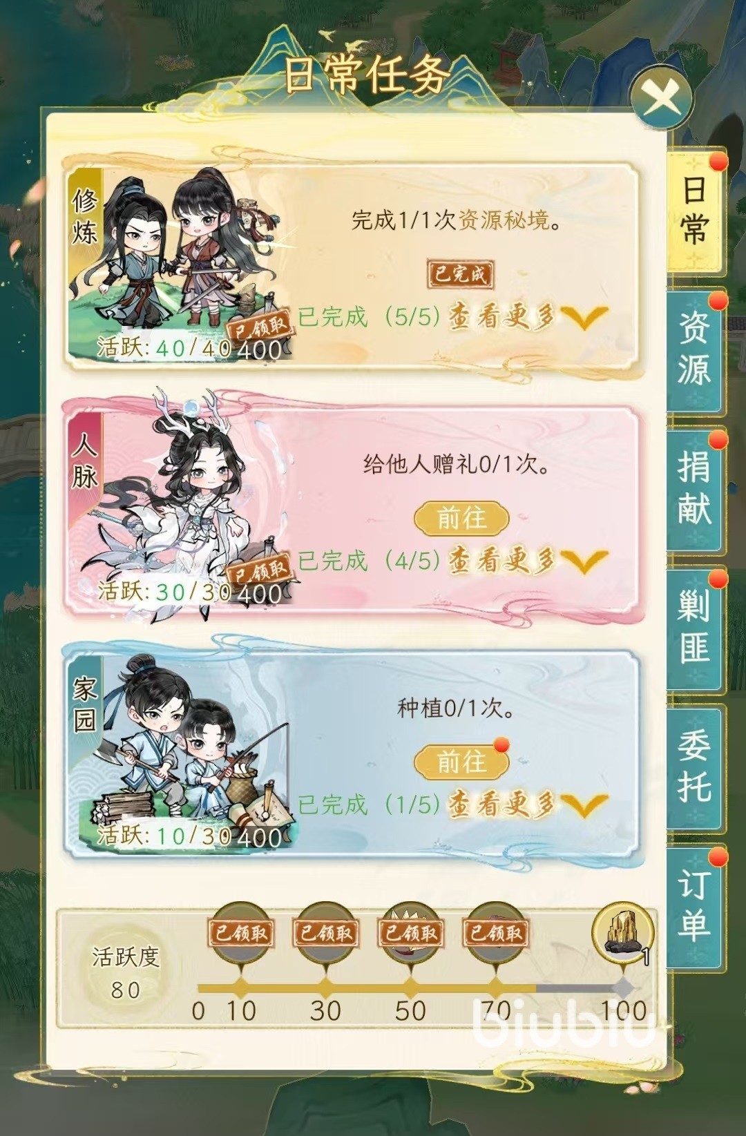首先需要完成的是活跃度任务,包括修炼、人脉和家园。修炼主要包括每天完成一次资源秘境,然后进行一次城市捐献和剿灭一个野外匪徒。人脉方面去给他人赠礼一次,交谈一次和互动一次。家园种植方面是完成一次种植,一次动物投喂,提交一次订单和完成一次烹饪以及制药,这些主要给大家赠送的是活跃度,只要活跃度达标,就可以将每天的活跃奖励领到手中。