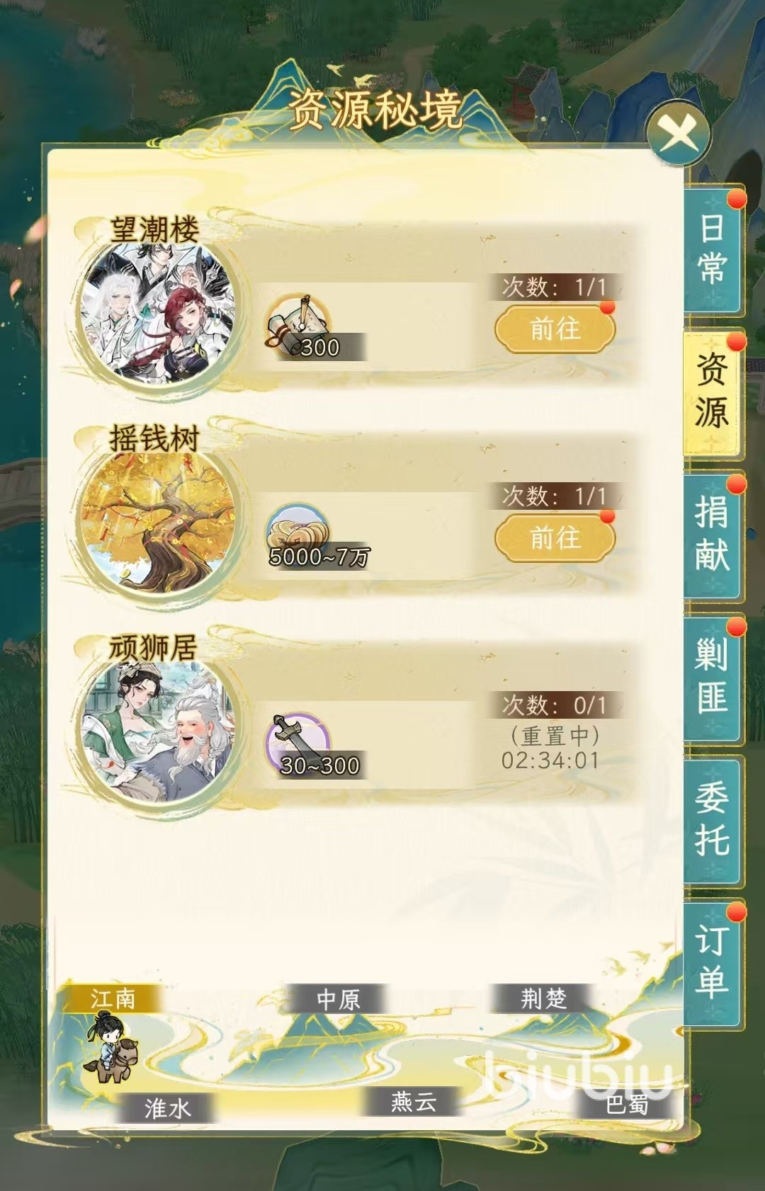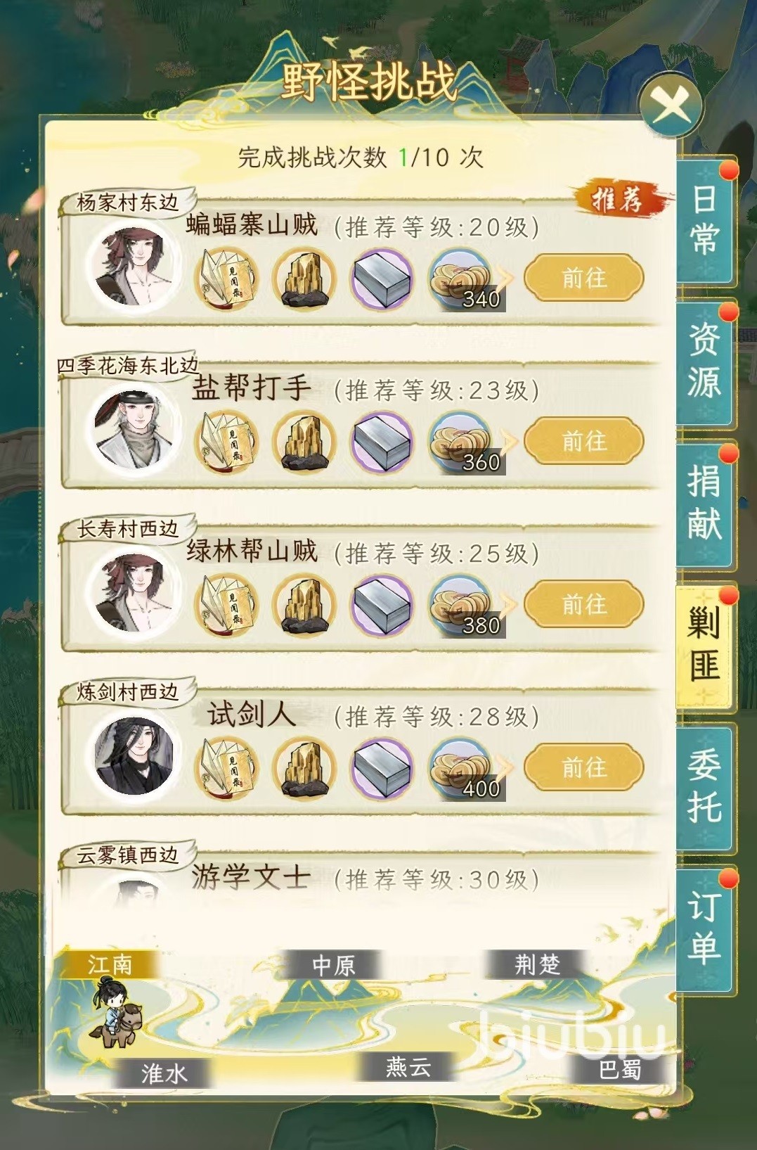 接下来是资源方面需要做的事情,包括望潮楼、摇钱树和顽狮居等,这些活动做完之后,能够拿到大量经验、铜钱以及剑意。然后是捐献,很多城市和门派都可以进行捐献,这些地方捐献的次数是有限的,每天的捐献都不要浪费,从杭州开始到姑苏、景德镇以及其他各个门派全部捐献一遍,这样有助于大家快速积累起威望,在不同的地图中兑换奖励。剿匪是属于战斗类型的活动,每天可以完成10次,这里小编的建议是一定要根据系统的推荐去走,推荐的都是符合当前等级的怪物,能够降低难度提高完成的几率,当然如果对自己的实力有信心,越级挑战也是可以的。