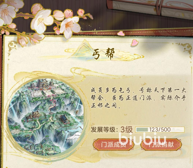 丐帮:作为江南区域的门派,坐落于狮子山下。山脚下的屋子排列整齐,村民会在这里劳作或者是经营小生意。丐帮弟子还会行走江湖,会有一些的绝招,例如通过乞讨可以获取铜钱。专属的门派武学还会拥有丰富的招式,其中就有打狗剑法。打狗剑法的招式还是变化多端的,可以有效降低敌人的命中几率,往往都会让对方防不胜防。