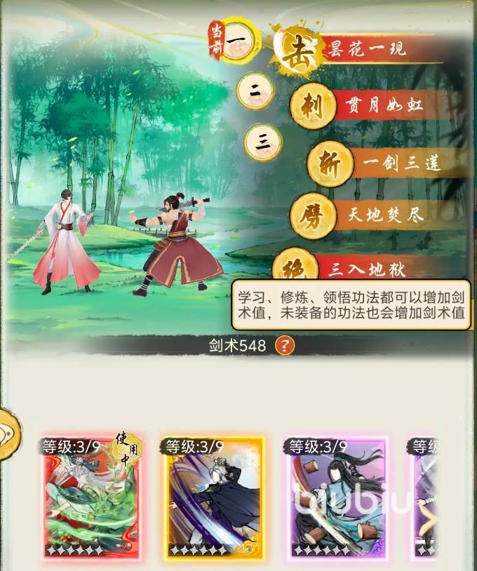T3级有北斗,以暴击为主,适用性没有想象那么高。无相武学也还不错,拥有好用的反击机制,对于一些特殊的敌人有神器的效果,达到出其不意的打击效果。一万八千剑武学具备禁疗效果,能获取敌人的增益buff,特定战场环境好用。
