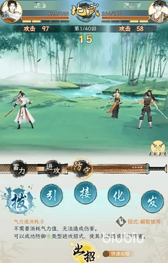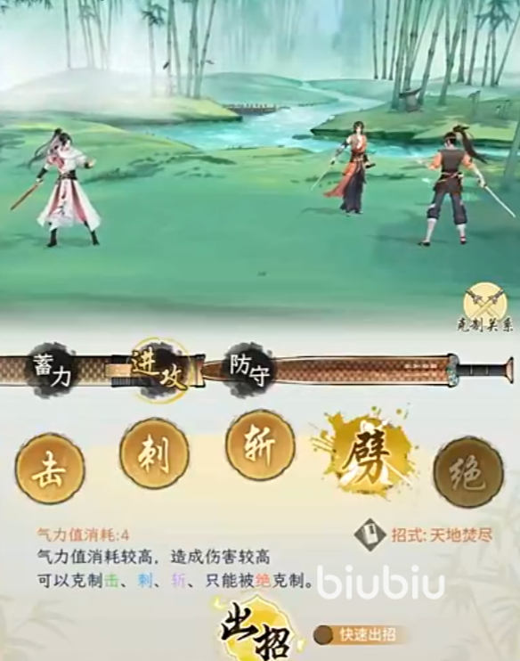 进入战斗对局后,大家能看到三个选项,分别是蓄力、进攻和防守,进攻可以选择人物的输出招式,对敌人造成相应的伤害,每一个角色分别有5招能力,分别是击、刺、砍、劈、绝,越靠后伤害越高,并且也能克制前面的攻击。