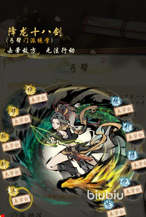 她降龙十八剑的“见龙”会在造成伤害的时候,有14%的几率给对方附加上眩晕2回合,此外妙莲华作为丐帮的一员会拥有乞讨的能力,大家如果加入丐帮也能学会,这样在闯荡江湖的时候,就可以向着遇到的其他角色乞讨,以此来获得铜钱。