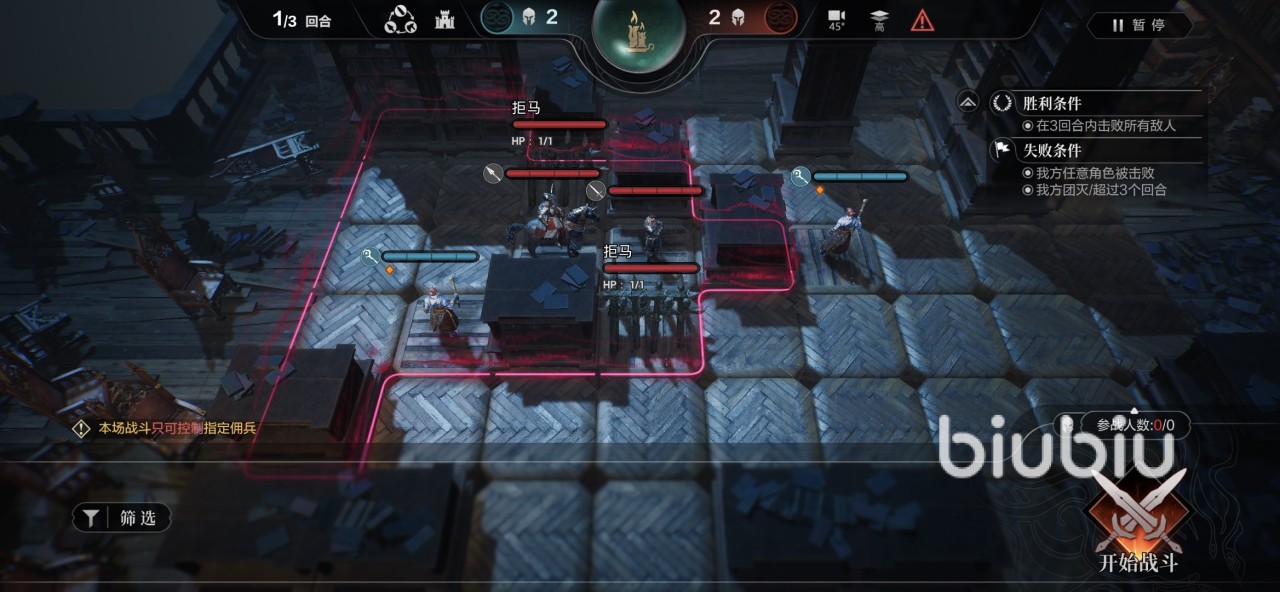 加尔多书库第十五层有个限制,是玩家只被允许控制指定的佣兵,胜利条件则是要在三回合内清空所有敌人,而失败条件是我方有任何一个角色被击败,或者超过三回合没通过。