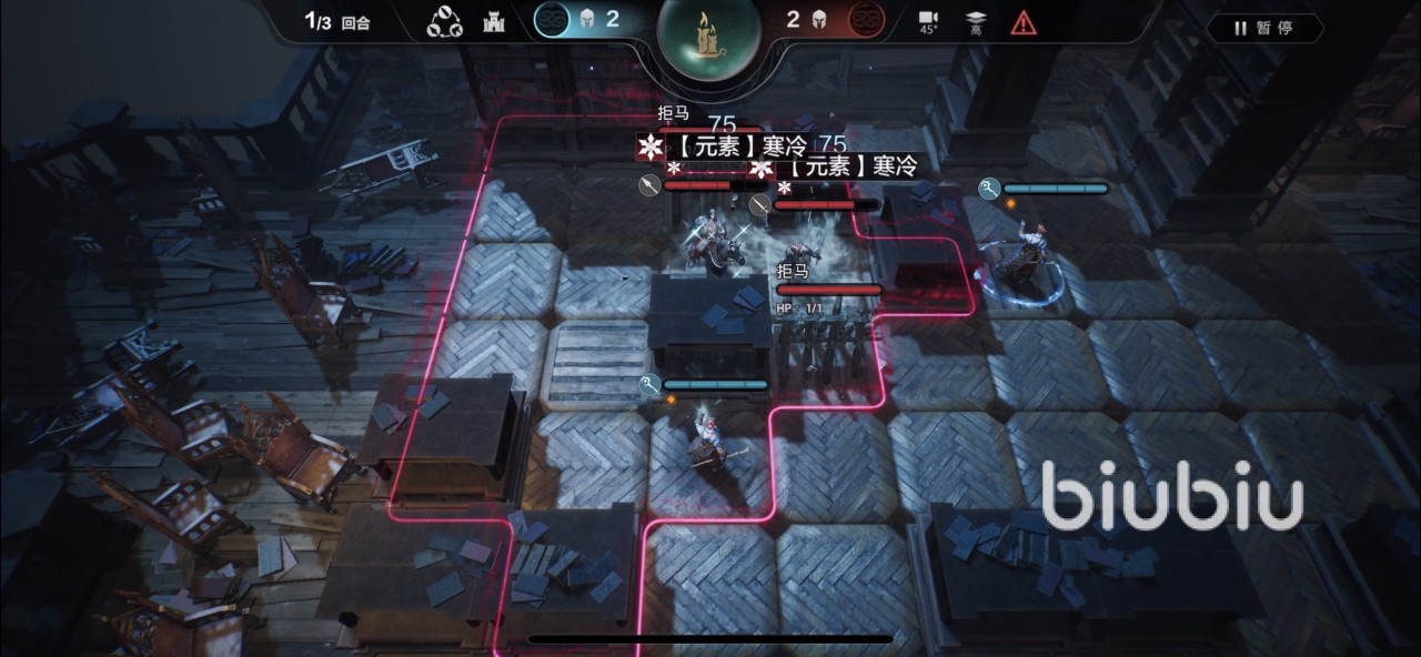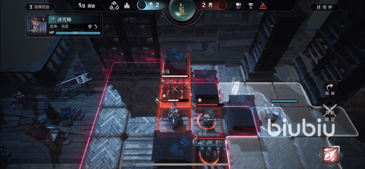 然后轮到右边的冰咒行动,拉到左上方一个的位置,再攻击骑兵和拒马,骑兵就会被冻住,无法攻击。接下来第二回合左边冰咒把骑士带走。右边的冰咒需要移动到右下方后用技能打剑士。