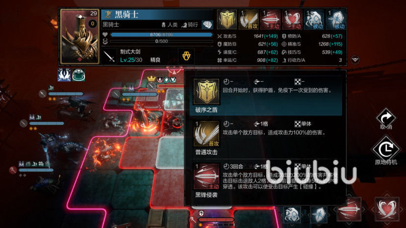 而黑骑士则是还未实装的角色,但在游戏中会以NPC的形式协助作战,所以玩家可以提前了解一下他的技能信息。破序之盾,回合开始获得护盾免疫一次伤害。普攻单体100%攻击伤害。主动“黑锋侵袭”单体200%攻击伤害,并击退,外加50%护甲穿透,还能使击退目标发生碰撞。主动“蔑视斩”,单体250%攻击伤害,对于半血以下敌人伤害提升20%。