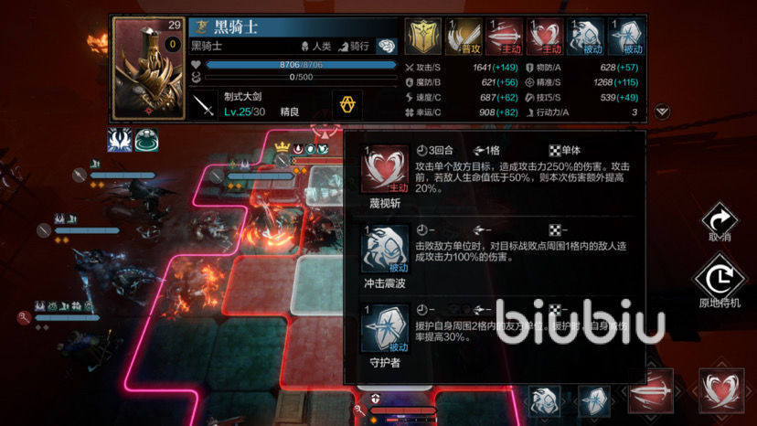 不难看出这个黑骑士是对标骷髅骑士的存在,技特点上与黑锋骑士有点相似,但技能倍率更高,而且面板也是很给力。每个回合都有1个无敌盾,自体是骑行而且有高倍率的碰撞技,还有2格范围援护和自体减伤,简直是将统帅、夜莺、韦德、里斯等角色的特点融合在一起了,相当超模。