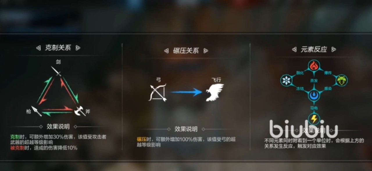 兵种之间存在着一定克制关系,像是剑克制斧,斧克制枪,枪克制剑。弓箭碾压飞行单位。当存在克制关系的时候,有30%额外增伤,这个数值会受攻击者武器超越等级影响。被克制则伤害降低10%。碾压则是100%额外伤害,伤害受弓的超越等级影响。