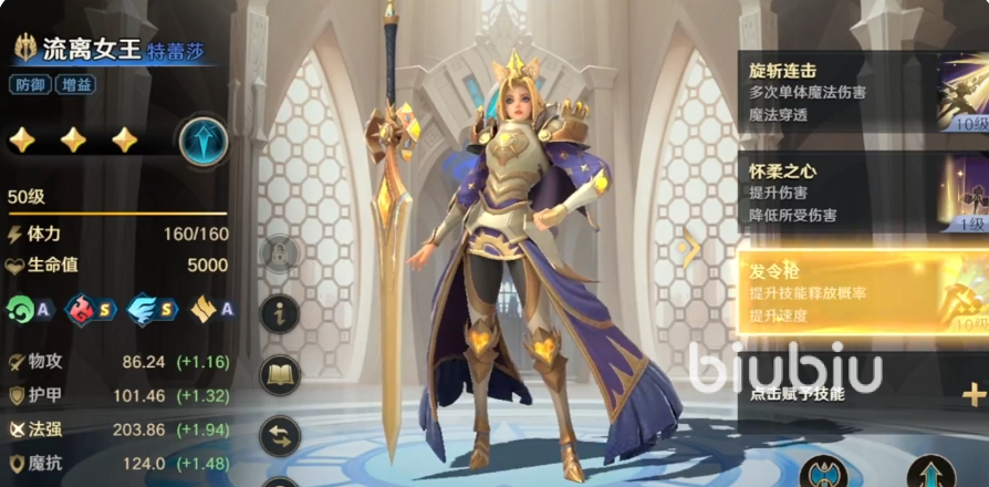 技能替换,在前期可以使用“士气高昂”与“守御过渡”。这个角色拥有别具一格的精美铠甲,佩戴了充满细节的披风和王冠,彰显着特蕾莎尊贵无比的气质。