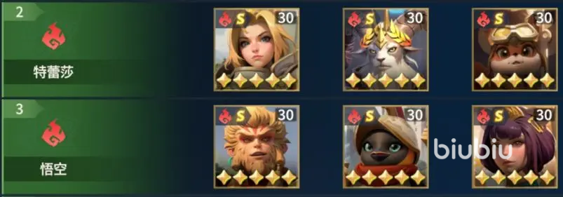 悟空是该队伍的核心角色,而他是签到就送的卡牌,每个玩家都能拥有,完全不用担心缺少英雄无法配置完整队伍的问题,拿破仑能提高队伍整体的暴击,在单卡当中的输出强度是非常高的,里昂能提供回血的效果,帮助队伍整体的续航效果提升,达到减少战损的目的。需要的核心技有圣痕,颂歌。比较好用的物理系输出队。