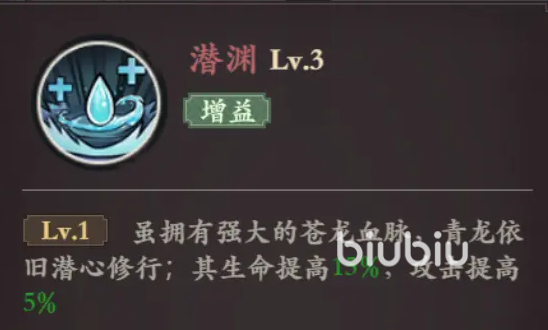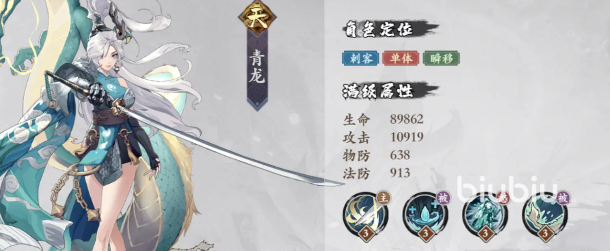 青龙的定位是输出,刺客。本身的防御能力比较弱,但是攻击,攻速和暴击数值都很高。青龙的1技能是龙闪,这个技能是一个主动技能,它可以让青龙直接瞬移到距离最远的敌人身后,并且对敌人直接进行攻击,这个攻击会造成200%的物理伤害。这个技能的攻击是可以进行暴击的。它的输出伤害很高,并且有着可以切后排的能力,缺点则是只能对单体进行攻击。青龙的第二个技能是潜渊,这是个被动技能是可以增加生命和提供攻击力。