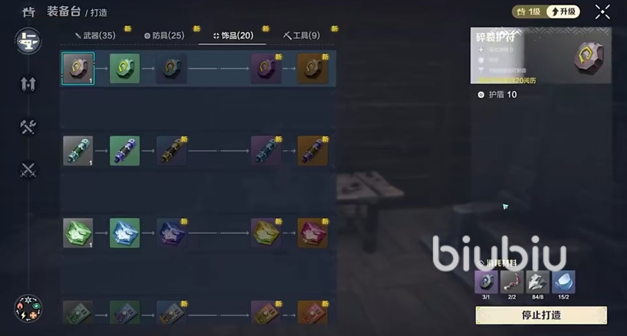 首先要明确的是家中有装备台的设置,各种各样的装备,是在这里通过打造获得。装备台在主线刚刚落地的时候,就会直接开启建造,所以是比较基础的建筑。安放好之后,后续还能根据需求随时进行移动和拆除,不用担心占据地方的问题。放置好之后直接靠近点击装备台,就可以看到目前能够打造的所有类型。