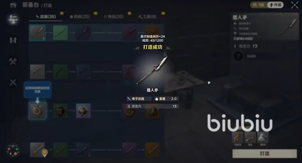 当然最初依然是从白板装备开始,消耗的材料也都是木头这样很基础的材料,一般来说先打造一个猎人矛,然后再打造一个轻壳盾,这样前期最基础装备就已经具备了。后续还可以打造品质更高的长矛和盾牌,例如绿色品质狩猎长矛等。高品质装备换上之后,属性能提高一大截,即使是初级装备,也有着非常不错的建模,所以外形方面绝对很炫酷。