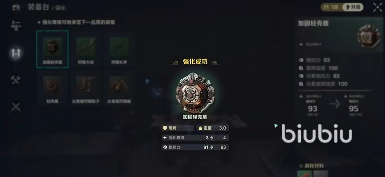 在装备台中除了打造之外,还有相应强化功能,进入到强化选项后,选定要强化的装备。就在左侧第2个按钮,消耗需要的材料后,就能对装备进行强化了,来提升各个方面的属性。武器一般来说强化之后都可以提高攻击力,盾牌可以提升格挡力,至于其他部位的装备也能够提升对应的属性,例如鞋子强化后能提升防御力等。如果出现材料不够的情况,还可以点击追踪材料,然后去获得相应的材料用于打造。