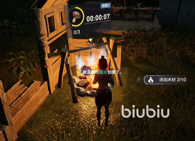 首先就是基础小屋的建造,玩家需要使用附近周围采集的木头临时搭建一个木制房屋,虽然这个房屋比较脆弱,但是前中期还是完全够用的,而且有时候会遇到极端的暴雨天气,使用小木屋是完全可以挡住的。