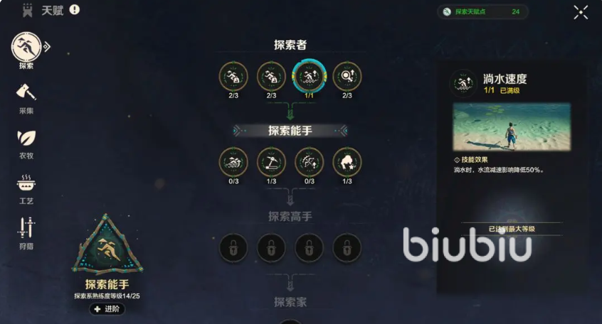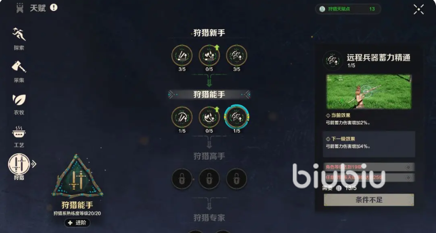 1、角色天赋,角色的天赋有五大类,探索,农牧,收集,工艺,狩猎,探索天赋能提高角色探险奔跑的耐力消耗,翻滚跳跃耐力回复,降低河流对人物减速之类的,还能提高人物扫描范围,进阶之后还会有更多的效果。