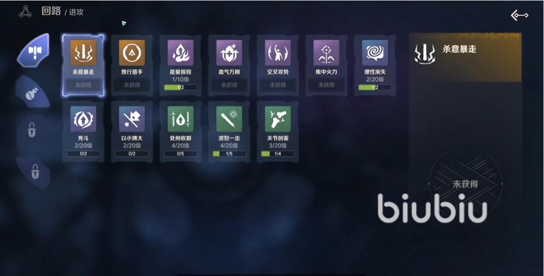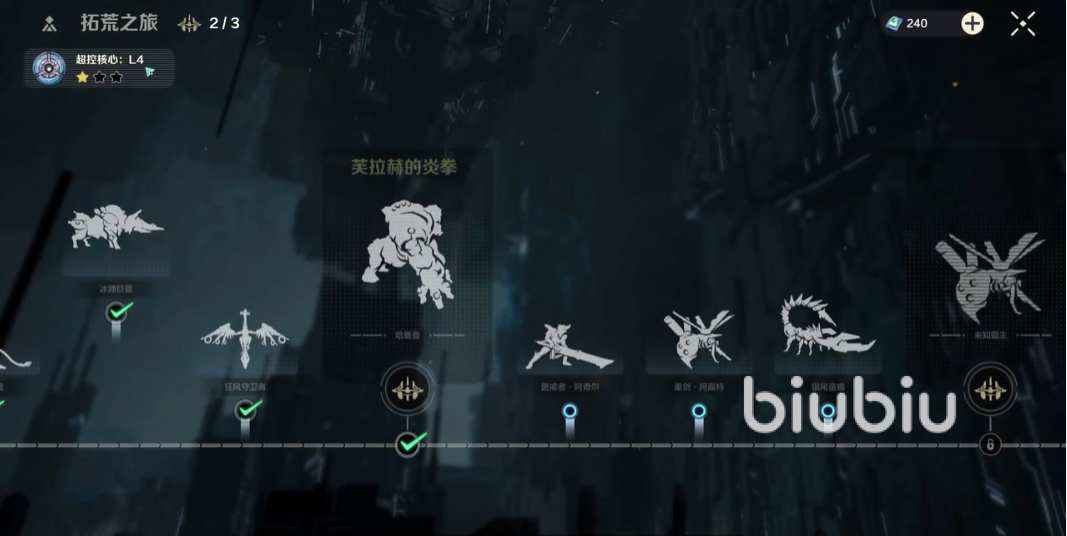 回路可以通过打开BOSS进度,或者系统菜单里面这个超控核心,进入相关的界面,直接选择左侧的第二个按钮,可以看到回路这边是有两个孔位能去装配,第一个孔位就是进攻的部位,第二个孔位叫做生存部位,不同的回路效果不一样,可点击查看。