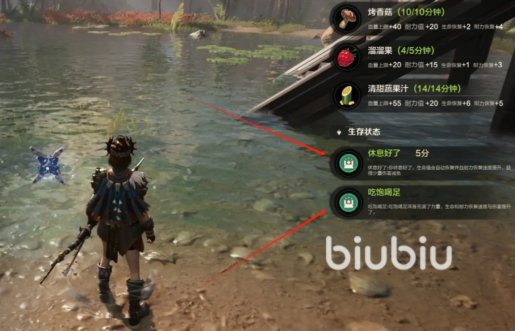 由于游戏有非常拟真的生存玩法,所以在冒险时一定要注意查看角色当前的生存状态,生存状态主要分成红色图标和绿色图标,绿色时代表正状态不用在意,产生红色就代表负状态,而负状态会使得角色一些数值降低,就拿最常见的饥饿来说,导致该状态的原因就是太久没有进食导致的饿肚子,从而让角色伤害降低并且影响耐久恢复,这时一定需要进食来改善,除此之外在河里面游泳或是淋雨会进入到潮湿状态中,要及时烤火来消除,生存状态不仅影响到我们日常采集任务跑图,也和战斗息息相关一定要多加注意。