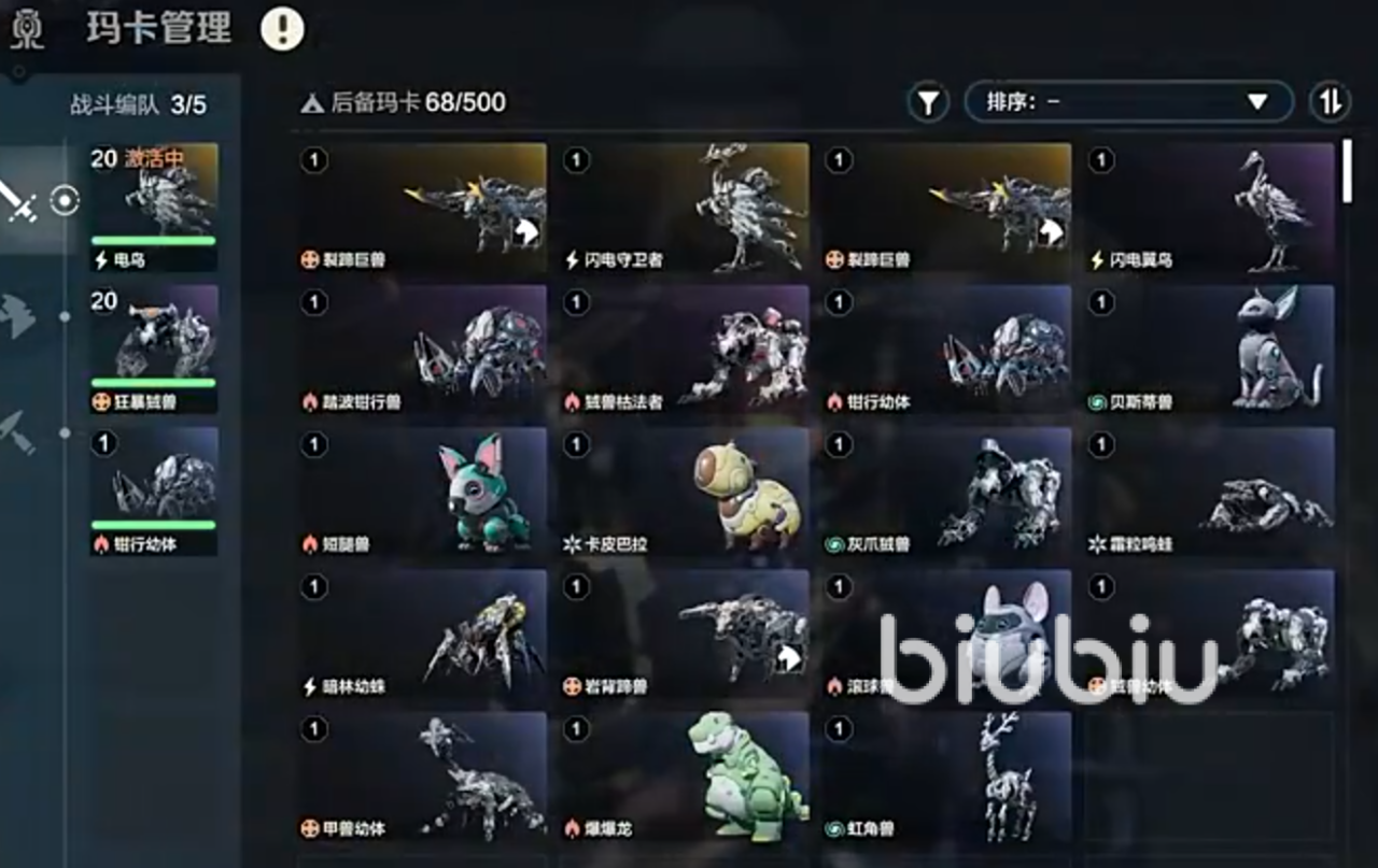想要管理玛卡时,首先点击家园中枢,在这里有一个“玛卡管理”,点开就能进入到玛卡管理界面中,查看每一只玛卡的信息和状态,玛卡的种类非常丰富,大家可以通过点击界面上方的“筛选”,直接筛选出我们现在需要的。