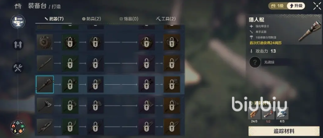 大家点击装备台,第一个板块就是打造系统,打造主要分为四类,分别是武器、防具、饰品和工具,各类配方在首次被打造出来后,玩家可以获得阅历提升自己的等级,所以建议大家在前期获得打造配方后,就直接收集材料进行打造,让经验收益最大化。