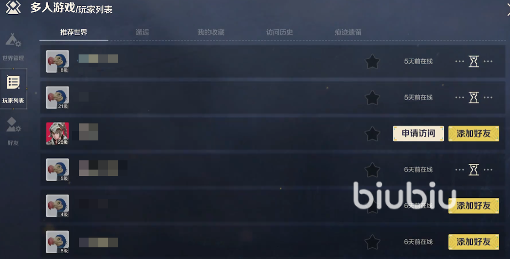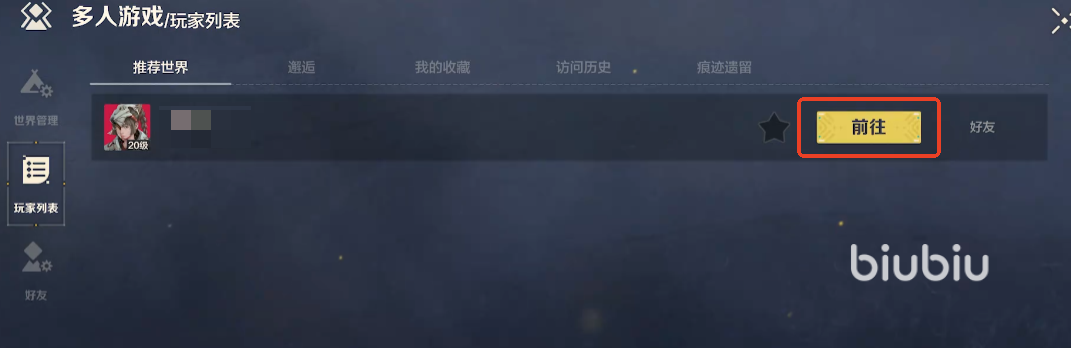 在这个选项中,玩家可以申请访问他人的世界,或是添加好友。下方的搜索框可以直接输入玩家姓名,方便快速查找特定玩家并申请好友请求。对方同意后,你们就正式成为好友啦!接着可以向好友发送访问申请,获得许可,申请按钮会变成“前往”按钮,点击即可进入好友的世界。