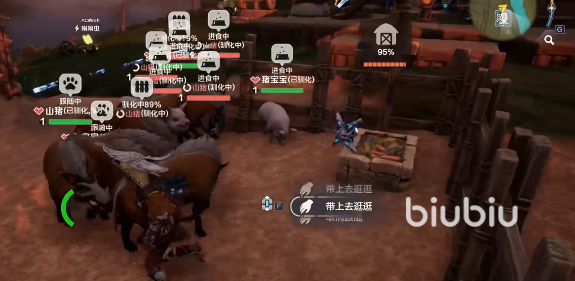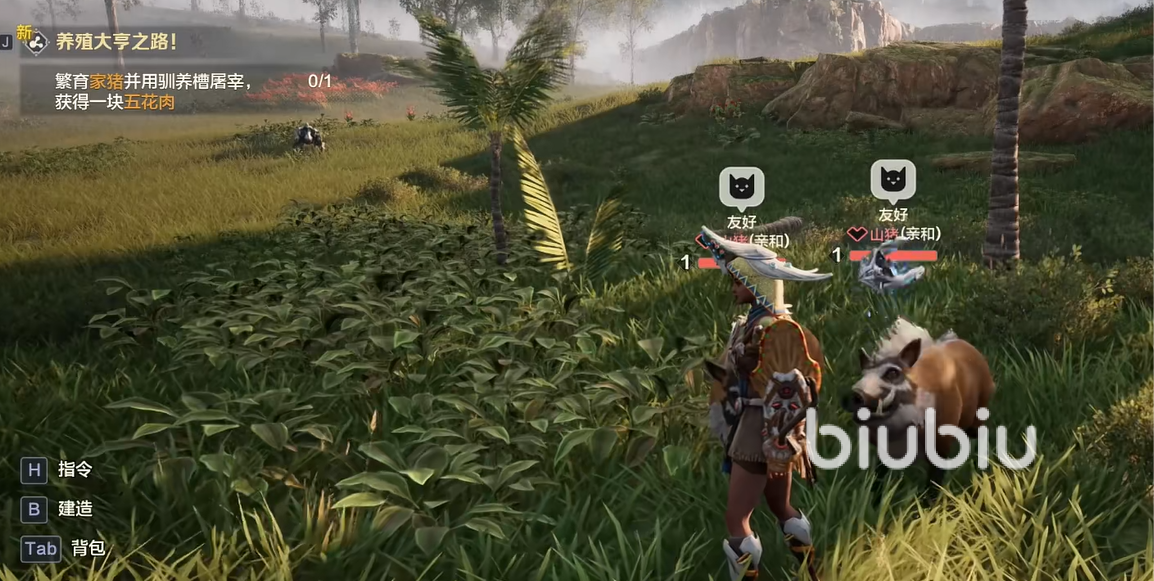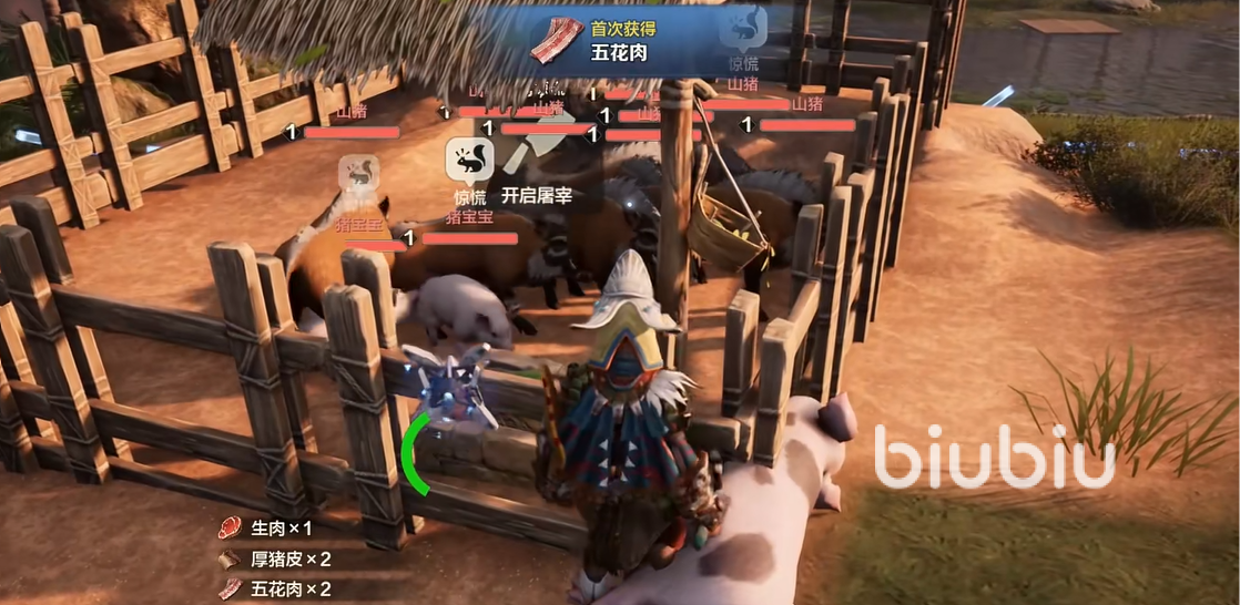 随着主线推进,大家的主线任务做到养殖大亨之路时。需要大家繁育山猪,并且将其驯养起来,然后获得一块五花肉。接着大家就可以在外面看到很多的山猪,这时它与大家的亲和度较高,处于友好的状态。大家走到哪,山猪就跟到哪。