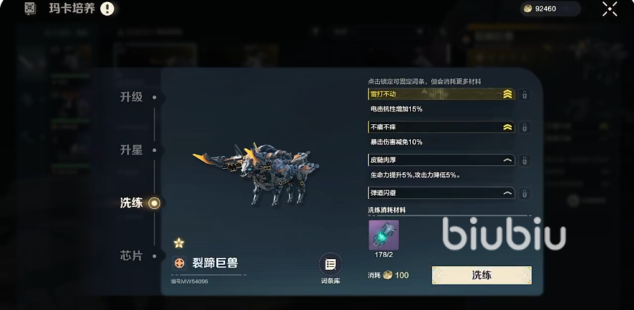 洗练主要针对的就是宠物的词条,从词条的外观就能看出来,在洗练界面点击词条库,可以看到,这只对应的玛卡所有能够被洗练出来的词条,从词条库的情况来看,暂时还没有针对每一只玛卡进行定制的,而洗练需要消耗的材料之一就是洗练原件,其次就是亚金。