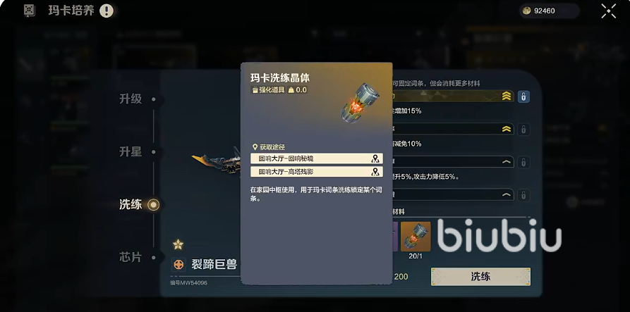在进行洗练之前,可以将想要的词条锁住保留下来,不过锁住的词条也是要额外使用其他高级材料的,也就是洗练晶体,一般也能在副本里面获得,洗练后,锁住的词条会直接进入到洗练结果中,如果洗练出来的结果不满意,也可以选择恢复洗练先前的词条属性。