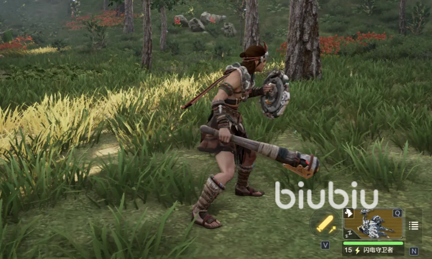 战斗是必须要拿起武器的,目前游戏的武器分为单手和双手两个类型,其中单手有长矛、狩猎直剑和猎人棍,它们的特点是攻击频率相对会比较高,并且能配合着具有格挡效果的盾牌一起使用,第二种双手武器包括大剑、锤和弓,大剑和锤的攻击速度会比较慢,但是伤害和削韧都比单手要更高,弓则是唯一的远程武器,能搭配不同属性的箭矢一起使用,整体来说双手武器的特点在于伤害高但攻速慢,且不能配合盾牌一起用;