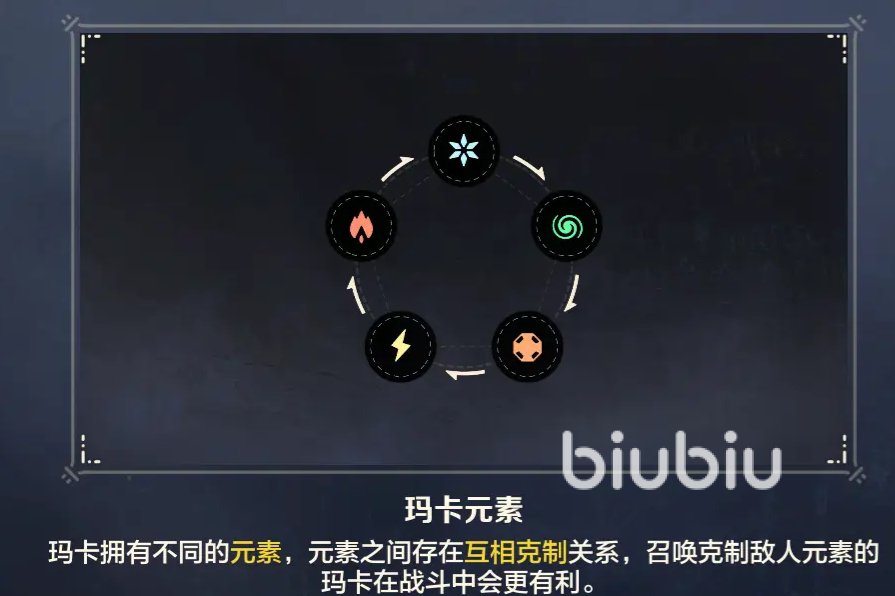 不同的玛卡会有不同的元素,总共有五种分别是电、岩、风、冰和火,它们存在相互克制的机制,具体可以直接查看下图,玩家在战斗时充分利用好元素克制的机制,比方说在讨伐风属性玛卡时,用冰属性的战技火箭矢,这样在攻击时不仅会有额外伤害加成,敌人还会有负面状态的累积,等积攒满后就会使得其进入到异常状态中,让讨伐更加容易。