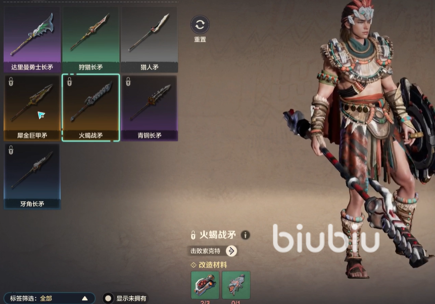 比如说火蝎战矛这个武器,它的获取条件是需要击杀索科特boss才能进行解锁,解锁以后才可以使用对应的材料打造装备,而这样的boss装备是占大多数的,所以获取这类衣服就需要玩家们多去世界内进行征服探索,击杀高级boss就能解锁漂亮的时装。