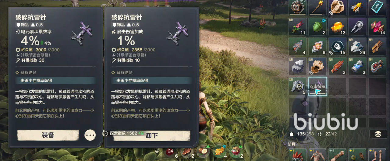 2025年05月13日 16:22 来源:散失多三地鼠荒野起源里面的道具种类尤其多,用好了就可以轻松解决对方,或者增强个人属性。那么荒野起源破碎抗雷针有什么用?用好了破碎抗雷针之后,才可以轻松应对某方面的战斗场景需求,然后又能让自己变强。毕竟在一些雷雨交加的天气中,若是大家的抗性不够高的话,很容易被雷劈死。