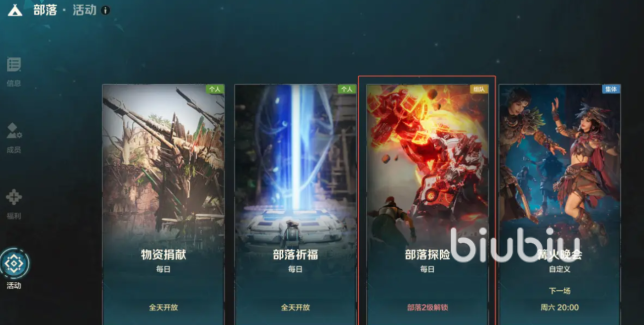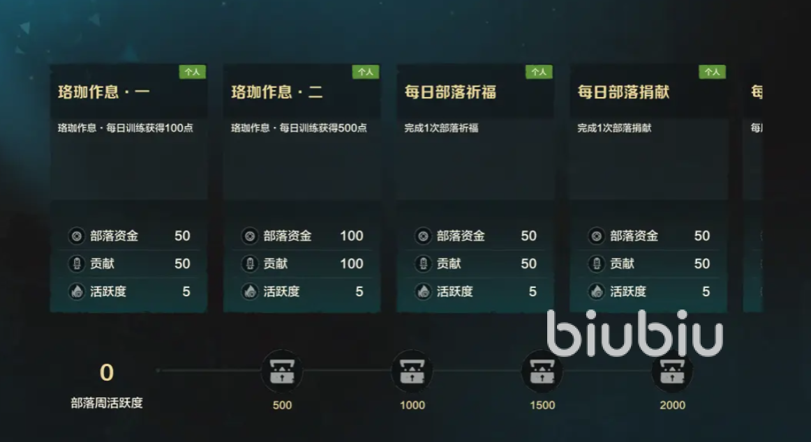 首先大家在加入部落后,能看到每日捐赠、篝火晚会等各类任务和探险挑战,大家完成个人任务,或者是参与部落内部的活动,能拿到不少活跃度,这些可以用于部落商店,在其中兑换各种我们有需要的物资。