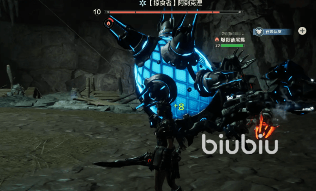 它的技能一会举起盾牌进入到防御状态下,减少自己的伤害并在结束后用盾牌砸击敌人,技能二会从远距离突然跳跃对落地敌人形成范围性冰伤,技能三会发射多道冲击波,大招会发射冰弹造成范围性打击,需要注意当大家被其他攻击命中后会被标记,这个大招的冰弹会直接锁定打击。
